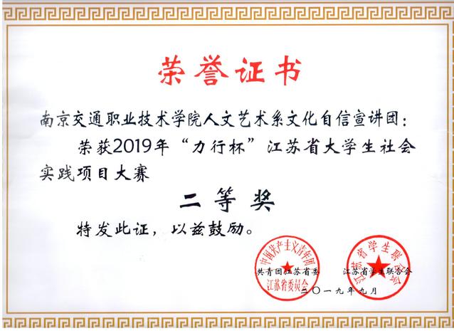 2019年暑期,共青团江苏省委在开展全省大中专学生暑期“三下乡”社会实践活动的同时,举办了“力行杯”大学生暑期社会实践大赛。大赛分为“建功新时代”全国实践团队和“助力高质量”江苏实践团队两个赛项。我院各实践团队根据大赛要求,紧扣“青春心向党·建功新时代”的主题,围绕赛项内容,精心准备、深入实施。8月底,学院在校内申报遴选的基础上,推荐优秀团队参加全省评选。