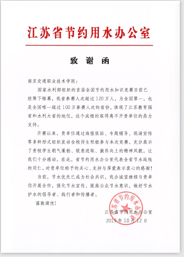 江苏省节水办近日向学院发来致谢函,高度肯定了学院组织参加全国节约用水知识大赛成效,感谢学院的支持和贡献。全国节约用水知识大赛于9月中旬至10月中旬开展,学院按照省节约用水办公室和省保护母亲河领导小组办公室部署,统筹安排,以各院系团组织为单位整体推进,积极发动学生参与。在广泛宣传动员基础上,以环保类社团和各级团学骨干为主体组建了重点参赛团队,同时广泛动员学生参与,先后有5000余人次参赛,为江苏参赛人次位居全国第一的优异组织成效提供了有力支持。