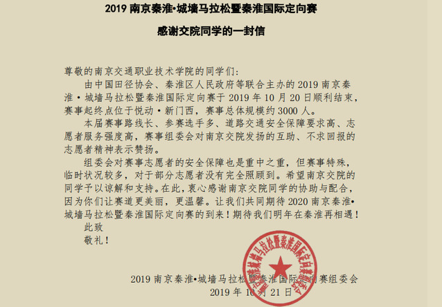 10月20日上午7:30,2019南京秦淮•城墙马拉松暨秦淮国际定向赛在南京市秦淮区悦动•新门西盛大开跑。本次赛事由中国田径协会、南京市体育局、南京市文化和旅游局、南京市秦淮区人民政府、南京市南部新城开发建设管理委员会联合主办,大赛由南京交院三百余名青年志愿者独家全程提供赛事服务。