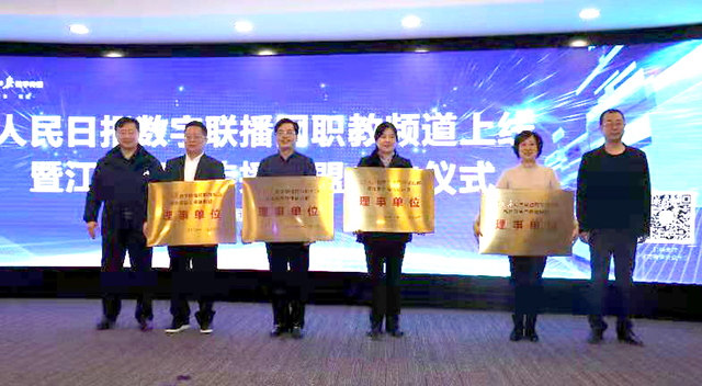 贾俐俐书记代表学院接受了人民日报数字传播有限公司副总经理柳晓森为人民日报数字联播网职教频道媒体传播与融合联盟单位的授牌,并与联盟各单位代表一同点亮大屏幕,宣布人民日报数字联播网职教频道上线。