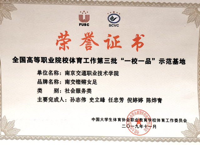 2019年11月,由中国大学生体育协会职业教育学校体育工作委员会、教育部全国高等学校体育教学指导委员会公体组和教育部职业院校教育类专业教学指导委员会体育分会等专家共同组成评审委员会,通过网络视频评审、现场评审、佐证材料复核、会议综合评议、公示等程序,对全国高等职业院校体育工作“一校一品”示范基地培育项目进行了评审,南京交院“铿锵女足”光荣入选。