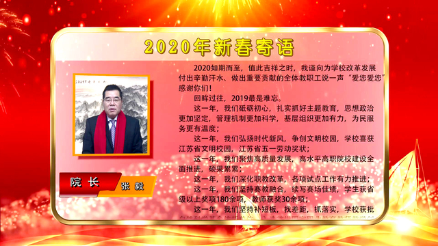 张毅院长在新春贺词中全面回顾了学院2019年聚焦高质量发展,深化职教改革取得的喜人成效和2020年的工作思路,并向为学院改革发展付出辛勤汗水、做出重要贡献的全体教职工表达了衷心感谢。他表示,时代壮丽,梦想前行,回首来时的路,我们激情澎湃。新的一年,又一轮寻梦之旅启程,我们将奋楫前行,努力奋进,以梦为马,不负韶华。