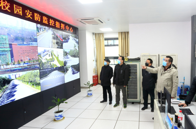 2月17日,张毅院长先后来到防疫物资仓库、能源管理中心、食堂和校园监控中心,巡查了解防疫物资储备和使用、校园用电安全管理、餐饮卫生和安防监控指挥等情况,听取了资产管理处、后勤管理处、保卫处等职能部门负责人关于校园防疫保障工作的汇报并提出了具体要求。在校园监控中心,张院长一行远程实时查看了一起门卫对来校人员询问排查、耐心劝返的处置过程,对安防保卫人员严格落实教育部关于学校防疫期间“五个一律”的要求,实施校门严格管控的履职尽责表示充分肯定。