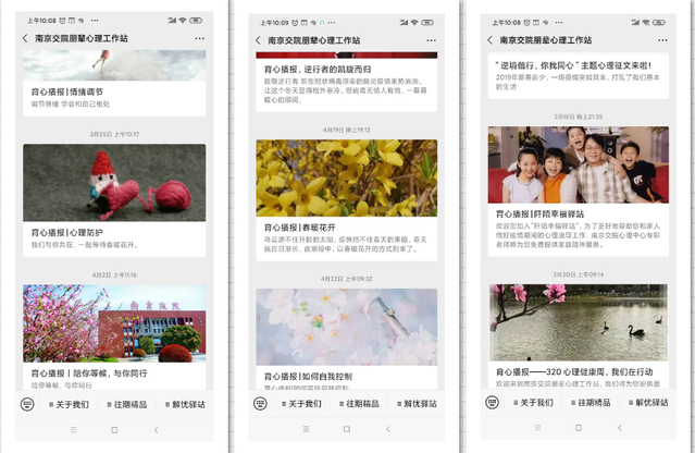 为更好服务学生,缓解因疫情引发的焦虑、急躁等问题,心理健康教育中心就疫情下的亲子关系、子女教育、个人情绪、学习规划等问题向重点关爱学生家庭在线开展问卷调查,期间共收到问卷 89份,主动联系有求助需求的家庭进行回访、解惑、答疑,针对性开展在线辅导;学院开展疫情主题校园VLOG大赛和心理征文比赛,鼓励学生以视频和文字形式记录抗疫期间的生活点滴以及心理变化。活动共收到七个院系45部VLOG作品、39篇心理征文作品,最终评选出优秀VLOG作品10部,心理征文14篇;疫情期间,全院各班级充分利用线上资源,以qq群视频通话、瞩目、zoom等方式,围绕“逆境携行,你我同心”主题在线开展心理班会,形成朋辈互助心理支持。其中,1910212班等19个班级的心理班会获评“优秀主题班会”;心理中心联合二级院(系)心理工作站共同开展了一系列心理支持服务,包括:南京交院抗疫心理支持QQ群”、Zoom视频心理咨询支持小组、抗疫连心线等。心理老师们通过电话、视频、语音等形式主动关心学生的学习、生活、心理等状况,引导他们理性应对疫情,积极乐观生活,回应学生关切,帮助解决实际困难;疫情期间,南京交院朋辈心理工作站微信平台推送系列“育心”网文共计19篇,广泛宣传心理防护知识,引导学生正视疫情,增强心理免疫力。