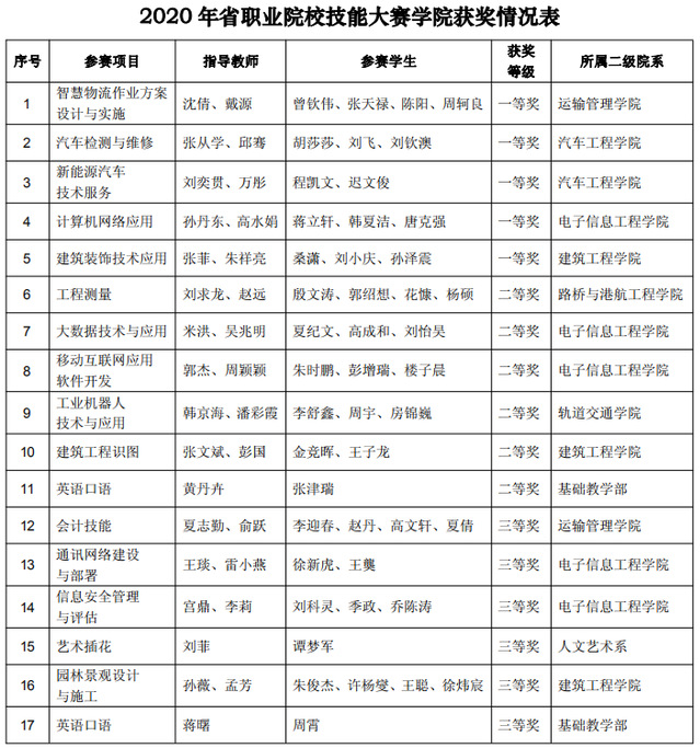 2020年江苏省高等职业院校技能大赛刚刚落下帷幕,共设42个赛项,学院积极组建了25支队伍参加了23个赛项的角逐,在强手如林、竞争激烈的赛场上,交院学子沉着应战、勇于拼搏,共获得17块奖牌,其中一等奖5项,二等奖6项,三等奖6项,具体获奖名单如下: