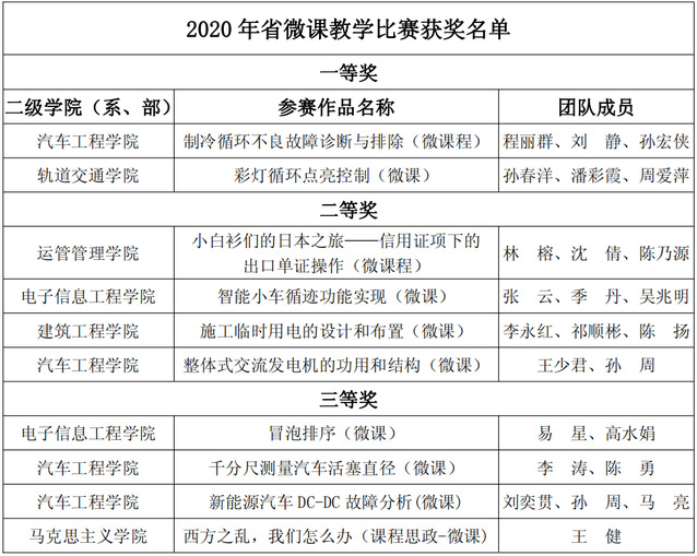 2020年江苏省高等学校微课教学比赛评选结果近日揭晓,学院在该项比赛中喜获2个一等奖、4个二等奖、4个三等奖的好成绩(共计报送了12项作品),获奖名单如下: