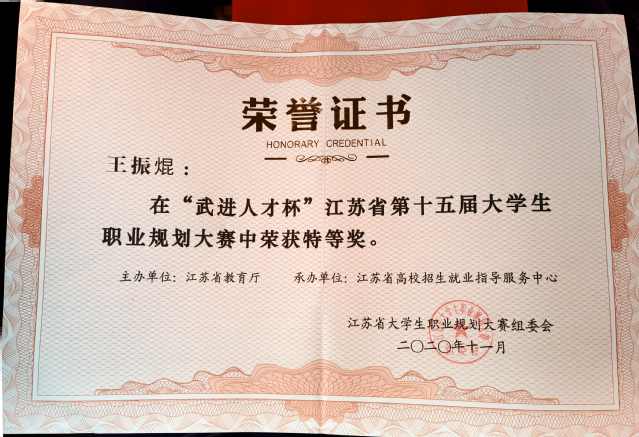江苏省职业规划大赛由江苏省教育厅主办,江苏省高校招生就业指导中心承办,今年已被江苏省高等教育学会认定为全省普通高校本专科生学科竞赛省级赛事。本次大赛从启动、初赛、复赛到总决赛历时8个多月,从全省140多所高校,超过20多万份参赛作品中选拔出60所高校的92名选手进入总决赛。王振焜同学以《‘音’你而‘声’,我心永恒》为题,讲述了自己专业主持人的职业梦想,最终以专科组第三名的好成绩荣获大赛特等奖。