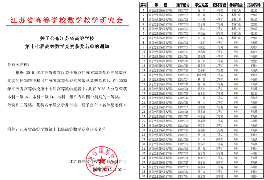 江苏省高等学校第十七届高等数学竞赛于今年11月7日举行。近日, 从江苏省高等数学竞赛组委会传来喜讯,在本次竞赛中,我院选送的74名参赛学生喜获佳绩,共有49人获奖。其中专科组65人中有 5人获一等奖,13人获二等奖,25人获三等奖;本科组9人中2人获二等奖,4人获三等奖。获奖率达到66%,超出本次竞赛平均获奖率16个百分点。