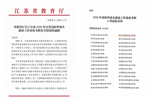 近日,省教育厅印发《省教育厅关于公布2020年全省高校毕业生就业工作量化考核有关情况的通报》(苏教学函[2021]2号),学院顺利通过考核并被评为“2020年高校毕业生就业工作量化考核A等高校”。
