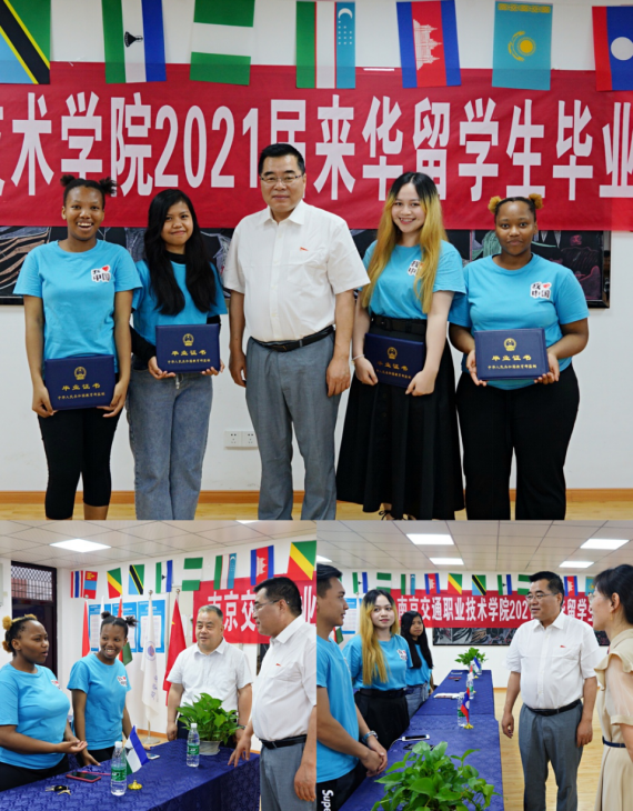 张院长亲切慰问了境内外留学生,与现场留学生一一交流,在给境内毕业生颁授毕业证书后,发表了精彩的毕业致辞。张院长充分肯定了留学生三年学习的成绩与收获,表扬了留学生在疫情期间克服困难坚持完成学业的良好品质,并对2021届留学生毕业表示了诚挚的祝贺,张院长提出了三点期望:希望留学生接纳变化,做美好生活的创造者;希望留学生讲好中国故事,做两国友谊的文化使者;希望留学生心怀学校,做南京交院的优秀校友。张院长相信留学生们一定能以文化融合的视角、知行合一的作风、良好健康的体魄创造出属于自己的美好生活。南京交院永远是留学生们的家,是他们坚强有力的后盾和温暖守望的港湾。