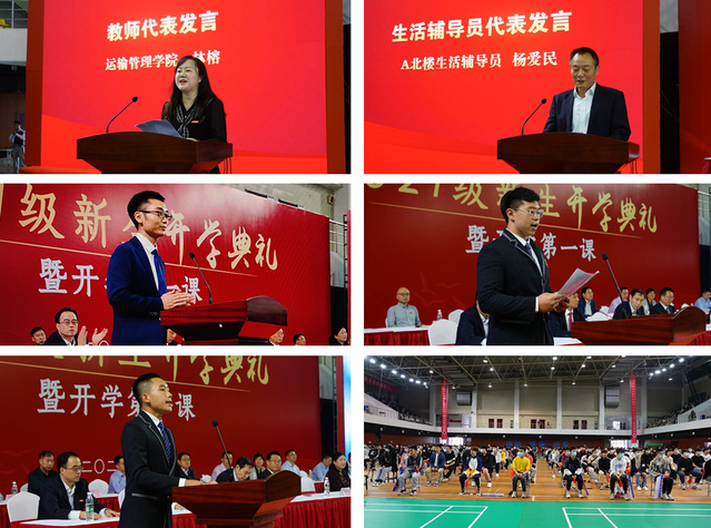 教师代表、运输管理学院教师林榕,2012届优秀校友、南京双宇工程技术有限公司总经理孙宇杰,生活辅导员代表杨爱民,在校生代表、院长奖学金获得者马成龙,新生代表、汽车学院新能源2101班余晨君先后发言,现场播放了家长代表的祝福视频,共同鼓励全体新生珍惜大学时光、增长自身才干、不负青春韶华,在南京交院踏上自己的精彩人生新征程。