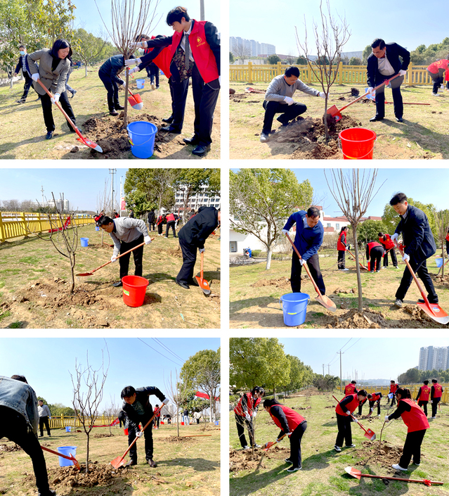 植树现场,在院领导的带领下,师生们热情高涨,团结协作,分工密切,领取树苗和工具,或二人一组,或三人搭档,挥锹铲土、扶直苗木、培实新土、提桶浇水,认真完成每一道工序,植树现场热火朝天,繁忙有序。新栽种的樱桃、杏子、山楂、柿子等树种错落有致、傲然挺立,展现出蓬勃生机。师生们表示,很高兴用自己的实际行动为创建绿色学校、建设美丽家园贡献一份力量。