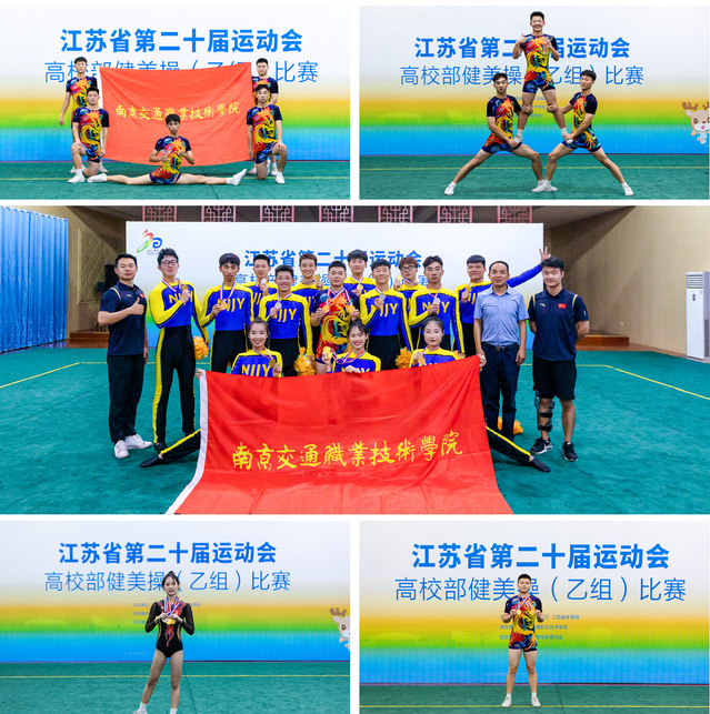 7月11-13日,江苏省第二十届运动会高校部健美操(乙组)比赛在南京交通职业技术学院成功举办。南京交院健美操代表队14名运动员在教练员的带领下,参加了全部六个单项比赛,全队上下克服疫情、场地、高温等不利因素,在三天的艰苦比赛中勇夺全部6个单项中的3个第一名和3个第二名,并获团体总成绩第一名,共计:四块金牌、三块银牌,实现了学院在省运会项目比赛中的历史最佳成绩,为学院赢得了荣誉。