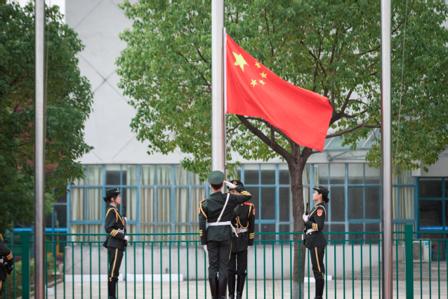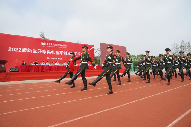学院国旗护卫队举行了庄严的升国旗仪式,在雄壮的国歌中,五星红旗冉冉升起,2022级新生军训成果汇报表演正式拉开帷幕。