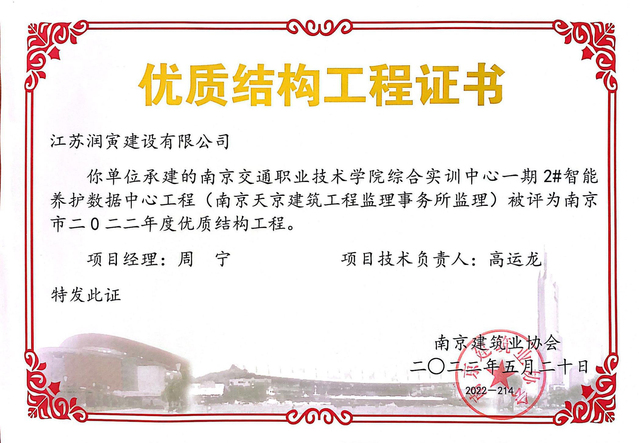经南京市建筑业协会委派专家组进场复查“施工现场质量保证条件、性能检测、质量记录、尺寸偏差及限值实测、观感质量”等指标,学院综合实训中心(一期)项目均达到国家《建筑工程施工质量评价标准》,经综合评定,获“南京市2022年度优质结构”工程。