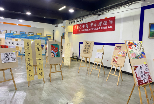 举办宪法主题书画作品展。宣传周期间,团委举办了以“宪法心中刻,青春勇担当”为主题的宪法普及书画作品展,同学们以墨寄情、以笔抒意,把学习党的二十大精神和宪法的心得感悟创作成书画作品、手工制作等多种艺术展现形式,共征集到全院学生作品170余件,并遴选出优秀作品40余件参展。