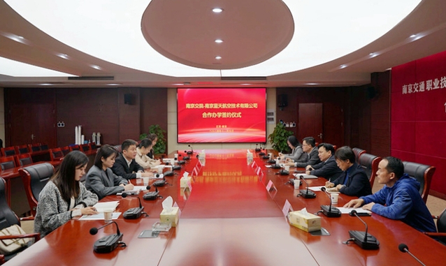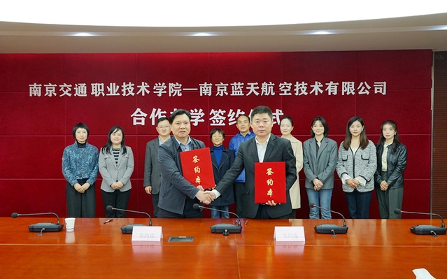 2024年11月5日,南京交通职业技术学院与南京蓝天航空技术有限公司在学院签订合作办学协议,南京交通职业技术学院院长王道峰,南京蓝天航空技术有限公司董事长兼总经理朱正华,学院科研处、运输管理学院及蓝天公司相关业务部门负责人共同参加。