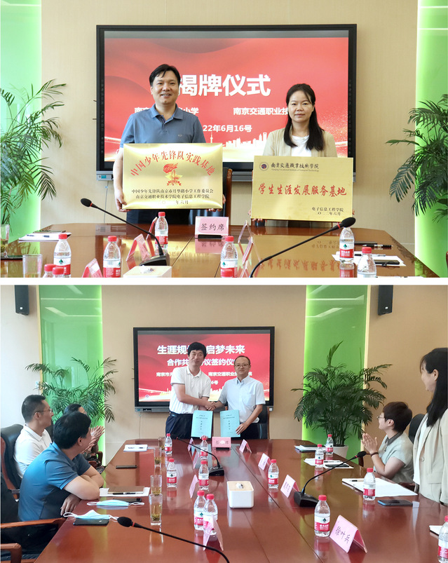 电子信息工程学院党总支书记杨金刚与月华路小学副校长徐叶兵签署了共建协议;王道峰副院长与夏翠莲校长分别为基地授牌;电信学院关工委常务副主任赵家华代表学院将职业启蒙书籍捐赠给月华路小学。