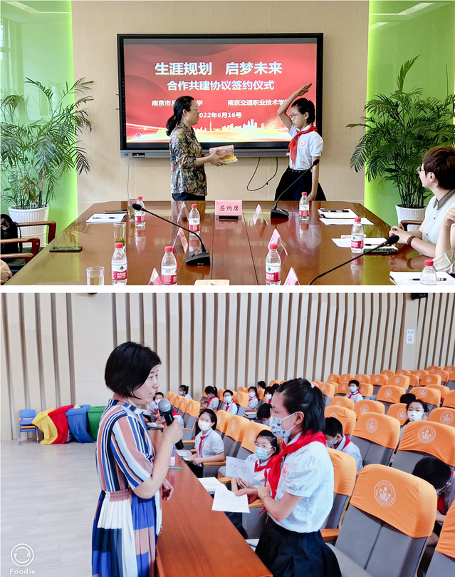 为充分发挥职业院校基层党组织在中小学职业启蒙教育中的积极作用,帮助小学生理解职业,提高职业能力培养意识,近日,全国党建工作样板支部、南京交通职业技术学院电子信息工程学院第二党支部携手月华路小学党支部结对共建职业生涯发展服务基地、红领巾校外实践基地。南京交通职业技术学院副院长王道峰、招就处处长耿巍、电子信息工程学院党总支、第二党支部及关工委相关负责人,月华路小学党支部书记、校长夏翠莲、副校长徐叶兵、学生活动部及课程开发部负责人出席了签约授牌仪式。