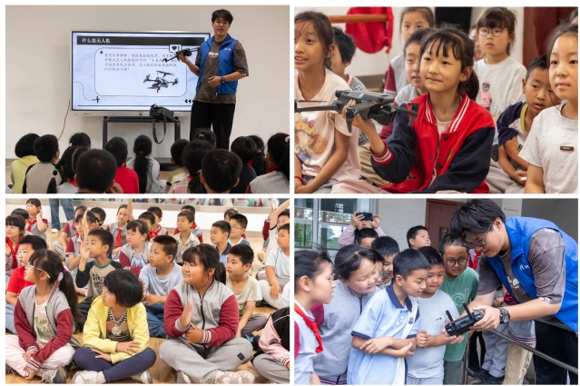 科技启航:无人机点亮童心梦想。在教室内,电子信息工程学院的学生志愿者为孔镇小学的孩子们讲解了无人机的飞行原理与实际应用,生动有趣的讲解让科技知识变得触手可及。讲解结束后,大家一同前往操场观看飞行演示。伴随轻盈旋转的螺旋桨,教学用无人机缓缓升空,在蓝天下划出优美的轨迹。孩子们纷纷驻足围观,现场师生还用镜头记录下这精彩瞬间。