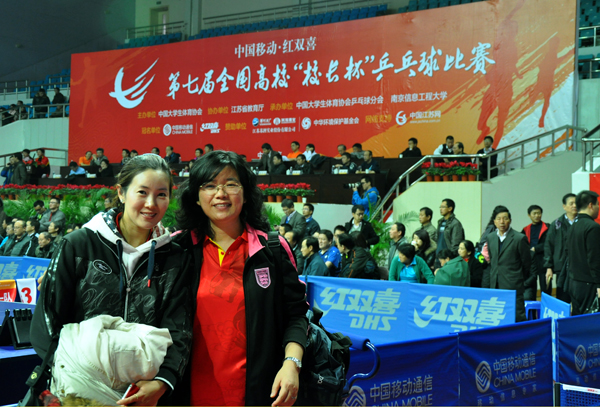 贾俐俐书记与江苏省高校代表队二队教练、亚锦赛混双冠军郭芳芳合影
