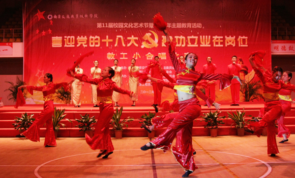 全院各党总支及分工会共组织了十三支代表队参赛,近130名教职工穿上精心准备的服装,登台献唱。从激昂高亢的《团结就是力量》到舒缓轻柔的《南屏晚钟》、从红色经典《游击队之歌》到青春动感的《最炫民族风》,教职工们用优美的歌声表达深切的爱国之情和喜迎十八大胜利召开的喜悦振奋之情,充分展示了在学院二次创业征途中同心同德,朝气蓬勃、协作进取的精神风貌。演出精彩纷呈,高潮迭起,掌声不断。