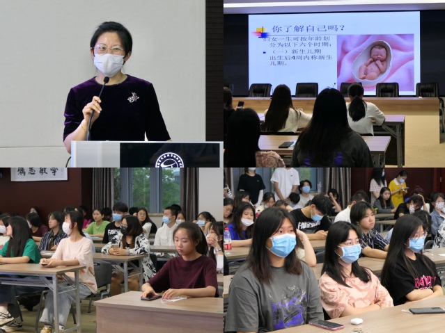 讲座开始后,王幸萍主任主要从女性生理健康知识、两癌的筛查与防治、艾滋病的防治与科普这三个主题讲起,围绕女性生理分期的特征和心理特点向同学们耐心讲解。整场讲座平铺直叙、娓娓道来,王主任以生动的图文资料、丰富的临床经验和通俗易懂的语言,从常见的妇科疾病入手进行了深入浅出、图文并茂的解读,主讲老师用温柔地语言加强了同学们对两性生理知识和心理变化的认知,揭开了两性的神秘面纱。讲座期间,她还通过案例分享与同学们谈到了大学间异性交往以及自我防护的相关知识,勉励大家自尊自爱,乐观自信,把握青春年华,谱写华丽乐章。