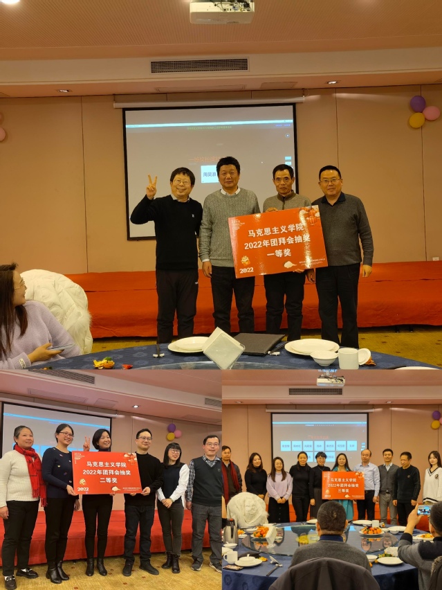 1月7日下午,马克思主义学院2022年迎新春团拜会顺利举办。学院党委周传林副书记、马克思主义学院全体教职工30余人齐聚一堂、共叙友情、共话未来。团拜活动在“马院这一年”影像回顾中开启,马克思主义学院全体教职工精心准备、积极参与,奉献一台集独唱、朗诵、相声、小提琴、游戏、大合唱等节目的团拜文艺表演。现场还举行了精彩纷呈的工会幸运奖抽奖活动。