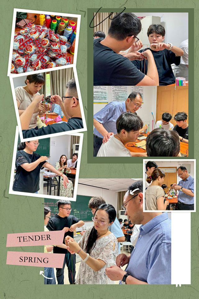 活动伊始,袁日成同学介绍了端午节文化意义和文化习俗,接着老师们对活动进行了细致的分工,并且以一桌为一组安排指导老师,分发材料,手把手的教大家如何编织网兜、编织彩绳。经过老师们的悉心指导,同学们了解到绳结打法的基本常识,也在相互配合的过程中,完成了具有独特风格的蛋兜和手绳。
