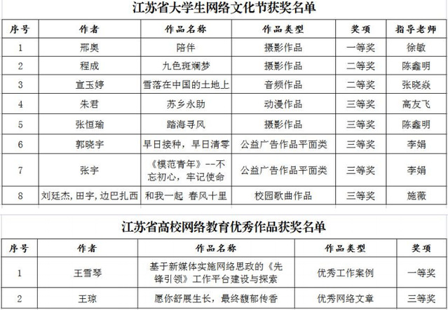 近日,江苏省委教育工委、省教育厅公布第二届江苏省大学生网络文化节和高校网络教育优秀作品推选展示活动遴选结果,学院荣获大学生网络文化节作品一等奖1项,二等奖2项,三等奖5项;高校网络教育优秀作品一等奖1项,三等奖1项。