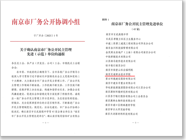 近日,经南京市厂务公开协调小组推荐、评审,我校被授予“南京市厂务公开民主管理先进单位”荣誉称号。