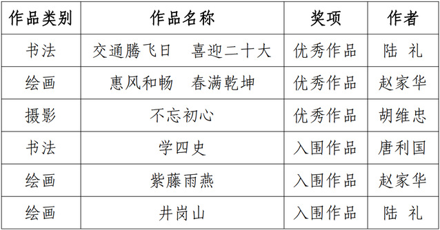 为迎接和庆祝党的二十大胜利召开,激励引导广大离退休干部永远听党话、坚定跟党走的信念决心,今年8-10月份,省交通运输厅开展了离退休干部“喜庆二十大银发再出发”书画摄影作品征集活动,近日发出《省交通运输厅关于离退休干部“喜庆二十大· 银发再出发”书画摄影作品征集评选结果的通报》(苏交老干〔2022〕2号),对评出的优秀作品16幅、入围作品28幅,进行了表彰。