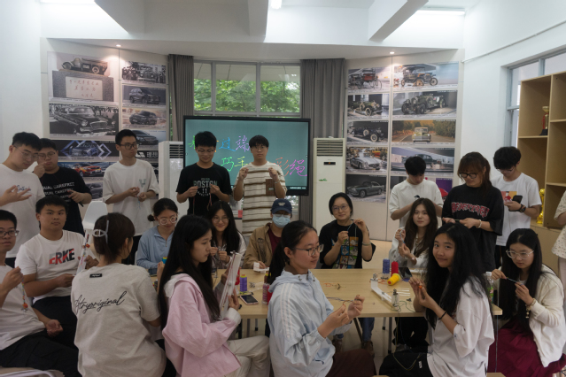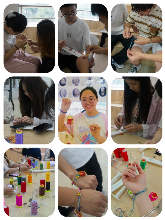 活动现场,在两位老师的指导下,同学们挑选了心仪的彩线,按照自己喜欢的编织方法开始了彩绳编织DIY。大家或独立完成,或两三人合作,在编织过程中,遇到问题,同学们随时沟通、纠正,耐心细致的完成手绳编织。一条条色彩丰富、编法多样的彩绳在大家的手中创造出来,大家激动万分,纷纷展示自己的劳动成果。