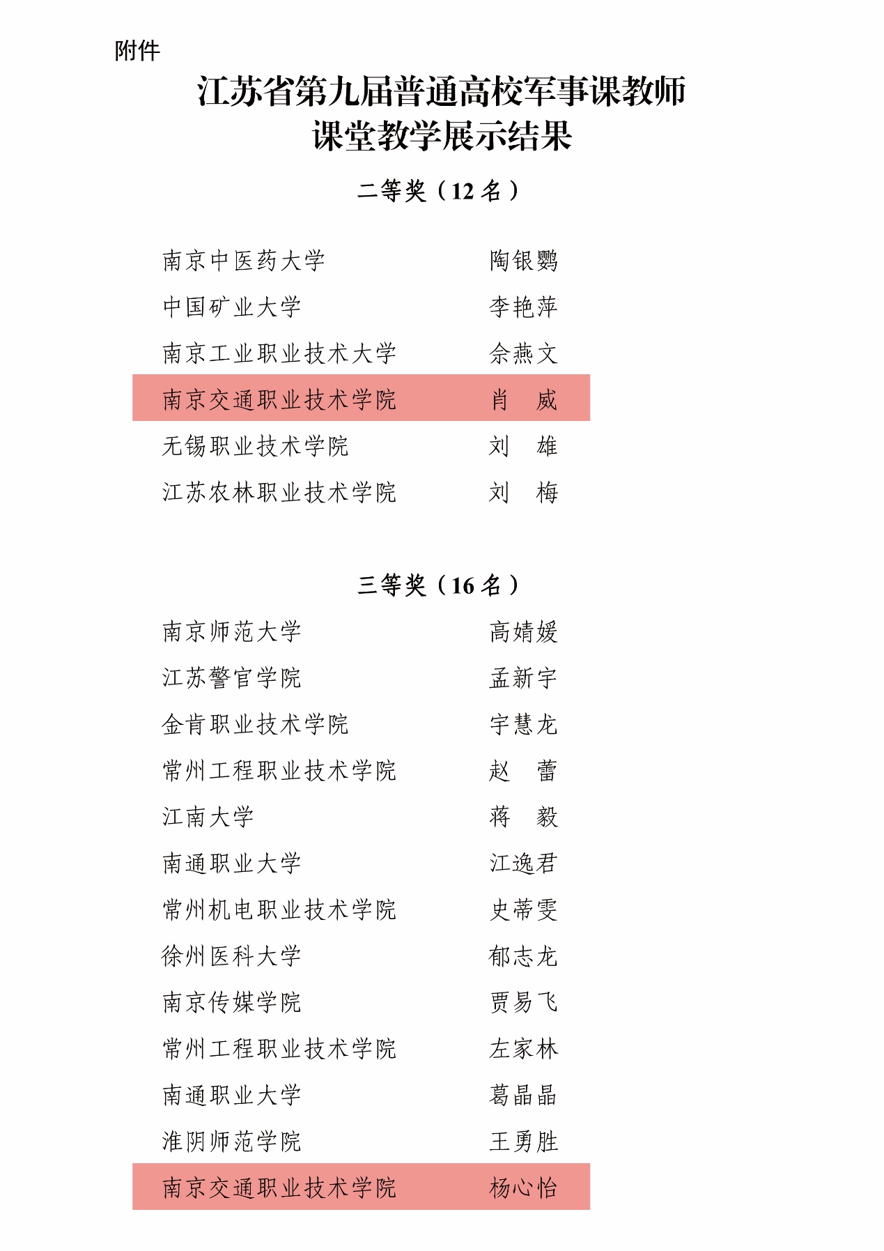 日前,江苏省第九届普通高校军事课教师课堂教学展示结果正式公布,我校军事课教师,运输管理学院辅导员肖威、轨道交通学院辅导员杨心怡成功入围决赛,并分别夺得本届竞赛二等奖、三等奖。