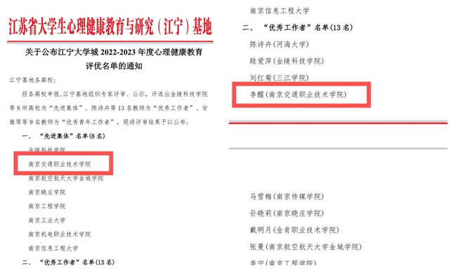 近日,江苏省江宁大学城大学生心理健康教育研究中心发文,学院荣获2022-2023年度心理健康教育先进集体,李醒老师荣获优秀工作者。