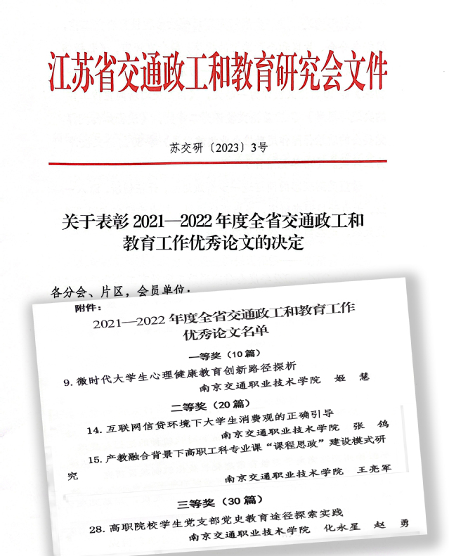 江苏省交通政工和教育研究会近日公布了《关于表彰2021—2022年度全省交通政工和教育工作优秀论文的决定》(苏交研【2023】3号),学院教师参评论文获一等奖1个、二等奖2个、三等奖1个,其中,《微时代大学生心理健康教育创新路径探析》(姬慧)获一等奖,《互联网信贷环境下大学生消费观的正确引导》(张鸰)、《产教融合背景下高职工科专业课“课程思政”建设模式研究》(王亮军)获二等奖,《高职院校学生党支部党史教育途径探索实践》(化永星 赵勇)获三等奖。