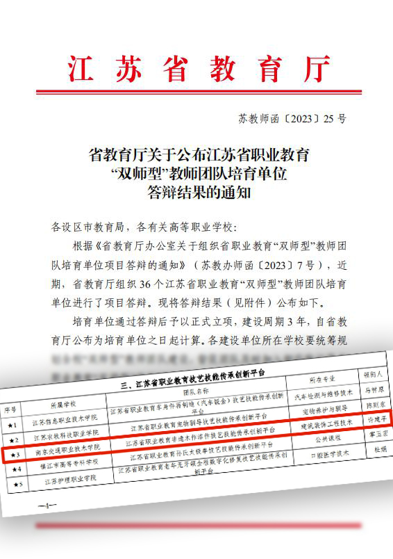 近日,江苏省教育厅发布了《省教育厅关于公布江苏省职业教育‘双师型’教师团队培育单位答辩结果的通知》(苏教师函〔2023〕25 号),学院“江苏省职业教育非遗木作漆作技艺技能传承创新平台”以优秀成绩顺利通过答辩,获得立项。