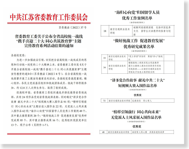 学院基础教学部直属党支部报送的《破解网络授课困境弘扬中国优秀文化 留学生汉语教学的探索与创新》获“海归心向党”归国留学人员优秀工作案例;运输管理学院党总支报送的《“党工学团”四协同 聚拢“四心”助统战》和电子信息工程学院党总支报送的《增强高校二级院系民主党派教师履行立德树人根本任务职责作用的实践探索——以南京交通职业技术学院电子信息工程学院为例》均获“做好统战工作 促进教育发展” 优秀研究成果;机关二党总支报送的《扎根岗位 同心育人》获得“讲多党合作故事 献礼中共二十大”短视频大赛优秀奖;建筑工程学院党总支报送的《画好育人同心圆 共筑非遗传承梦》获“榜样引领前行 同心共向未来”无党派人士风采展优秀奖。