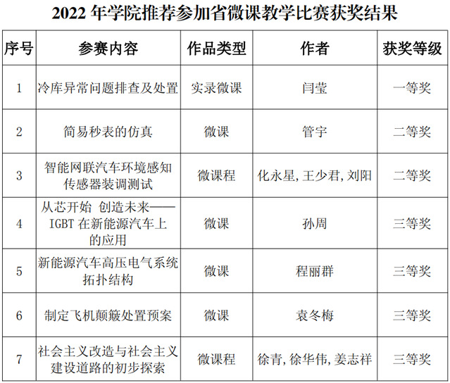 近日,2022年江苏省高校微课比赛评选结果揭晓,此次比赛学院共计报送9项作品,有7项作品获奖,其中一等奖作品1项、二等奖作品2项、三等奖作品4项,获奖数量在全省高职院校中名列前茅。