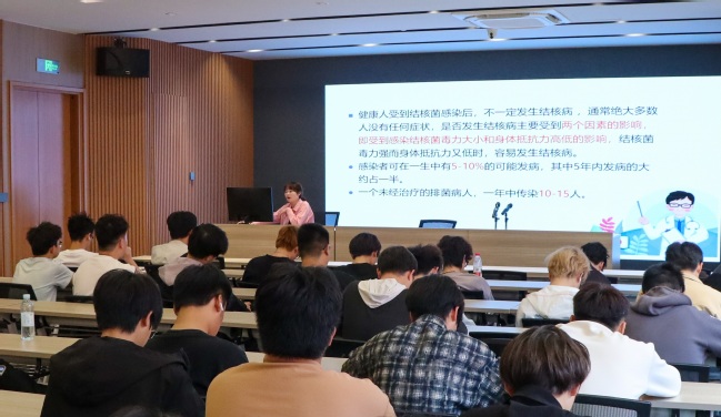 讲座中,张玉护士长详细阐述了结核病与艾滋病的传播途径、早期症状、规范治疗方法以及校园防控的关键要点。她以专业的视角和生动的实例,通过视频演示与PPT展示相结合的方式,向同学们深入浅出地讲解了艾滋病和结核病的防治知识。
