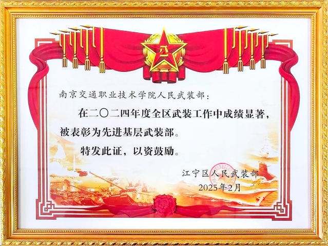 近日,南京市江宁区人民武装部对2024年度全区武装工作先进单位和个人进行了表彰,我院武装部被评为“先进基层武装部”,也是全区获此殊荣的5家单位中唯一一所院校武装部。