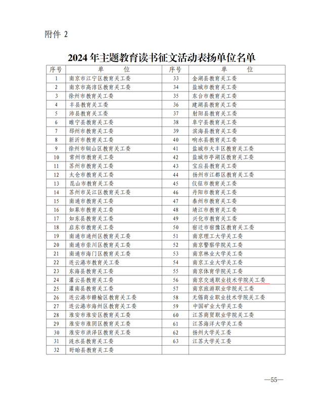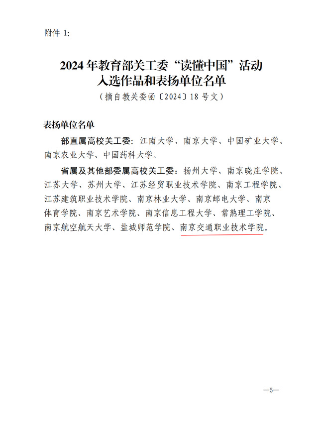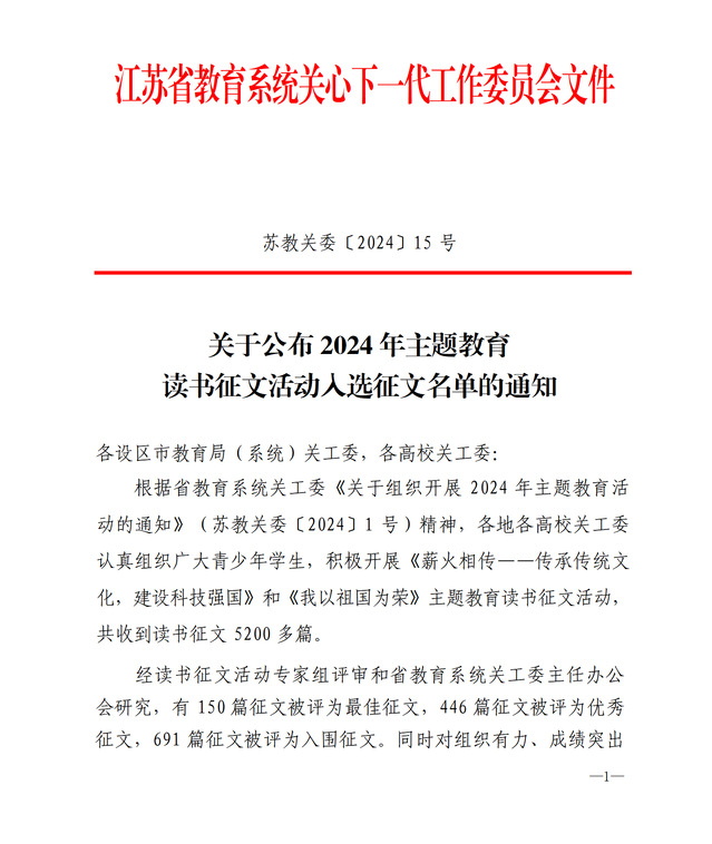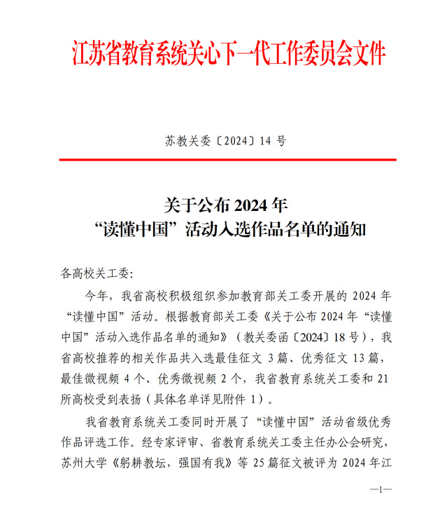 近日,江苏省教育系统关工委公布了“2024年教育部关工委‘读懂中国’活动”入选作品名单和“2024年主题教育读书征文”入选征文名单。