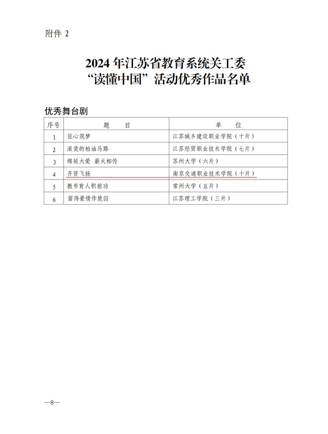 我校在2024年教育部关工委“读懂中国”活动中获得“表扬单位”荣誉。运输管理学院的舞台剧《齐贤飞扬》获得2024年江苏省教育系统关工委“读懂中国”优秀舞台剧荣誉。