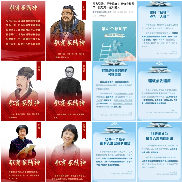 节日前后,学校专题制作“致敬引路人”和“教育家金句”海报集,利用官网、官方微信等平台推送宣传习近平总书记关于教师的重要论述和古今教育家名言及教育理念。9月10日当天,全校公共电子屏“为教师亮灯”,展示尊师重教创意主题。按照省教育厅要求,10日晚组织学校师生收看了“九月的芬芳-2025年江苏省庆祝教师节主题活动”节目。