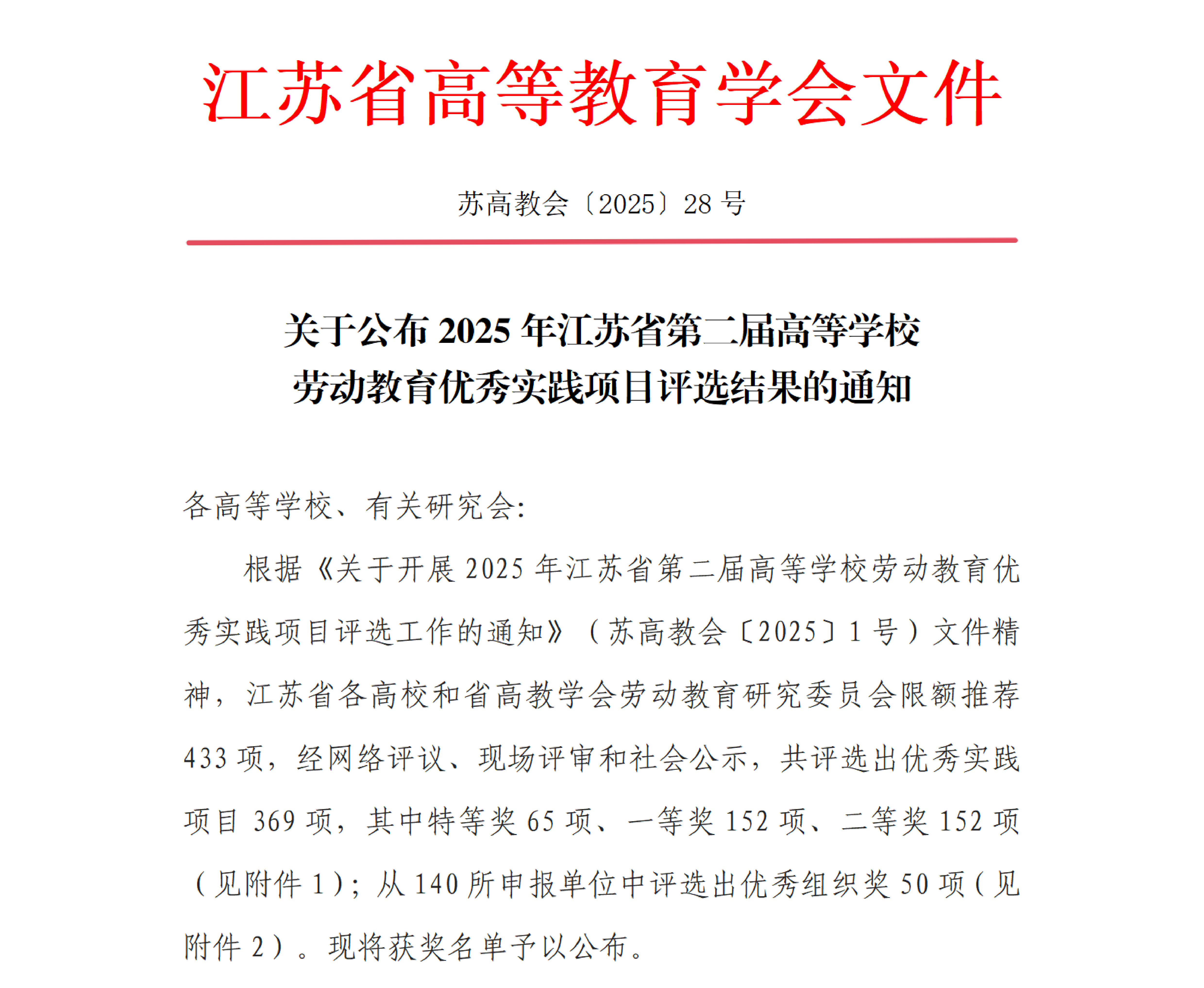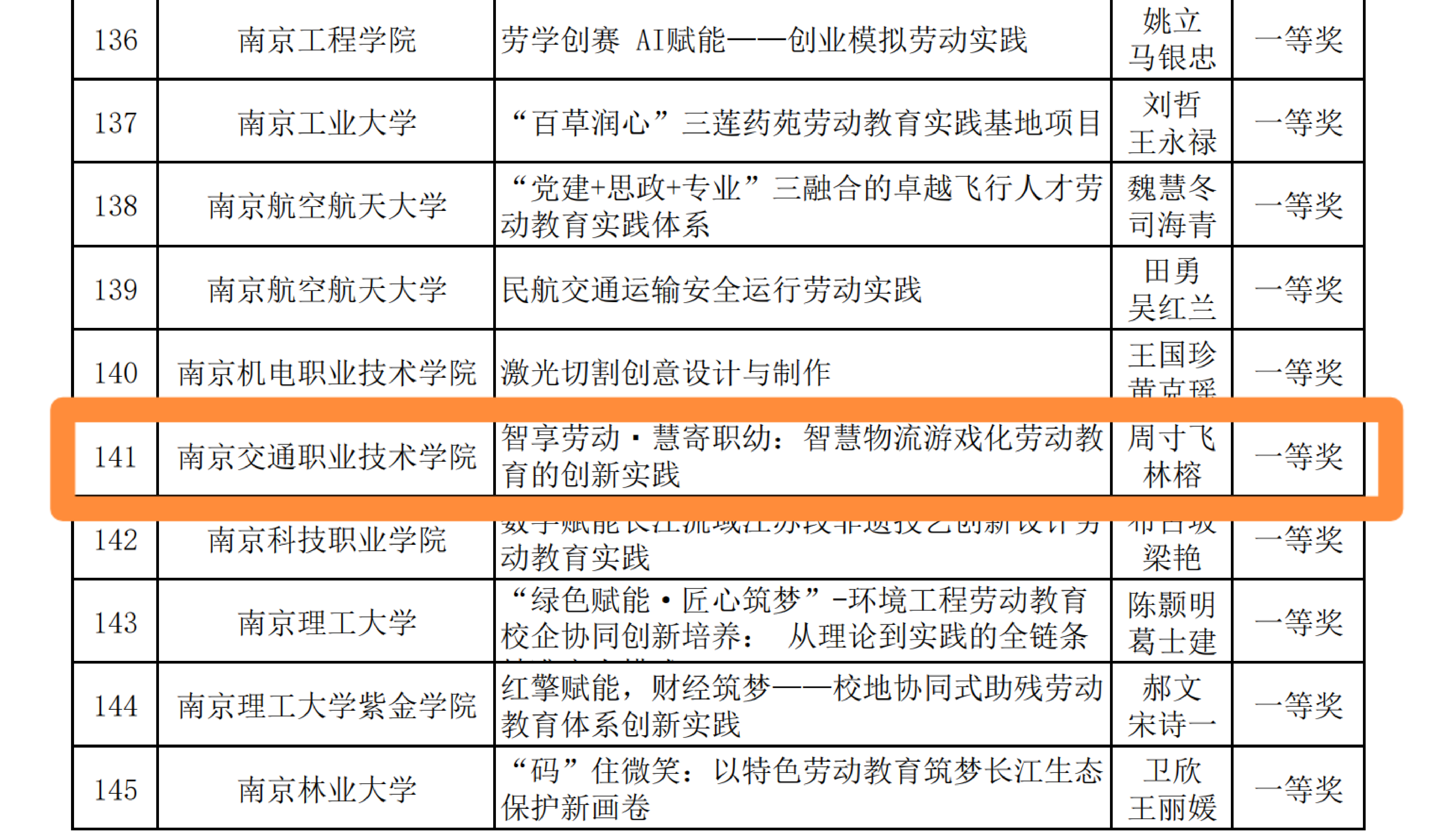 近日,江苏省高等教育学会公布2025年江苏省第二届高等学校劳动教育优秀实践项目评选结果,我校《智享劳动・慧寄职幼:智慧物流游戏化劳动教育的创新实践》(作者:周寸飞、林榕等)项目荣获一等奖。