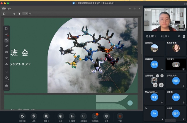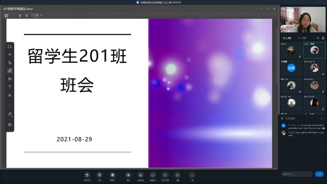 两位班主任分别向留学生们介绍了新学期各项课程安排以及任课老师所使用的上课直播平台,再次强调了上课纪律和各种规章制度。袁主任回应了留学生对线下授课以及重返中国学习生活的期盼,提醒境外的留学生们做好疫情防护,并希望留学生珍惜难得的学习机会,站在新的起点,制定新的目标,在提升中文能力,感受中国文化魅力的同时,更要在专业学习上多下功夫,收获专业知识和中国经验。