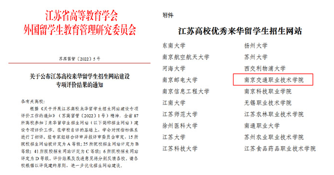 近日,江苏省高等教育学会外国留学生教育管理研究委员会公布了江苏高校来华留学生招生网站建设专项评价结果,学院来华留学生网站被评定为A等级。全省共87所高校参加了本次来华留学生招生网站建设专项评价工作,经院校自评、学会初评、专家综合评审并由评审委员会审议,15所院校招生网站被评定为A等级。