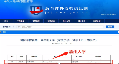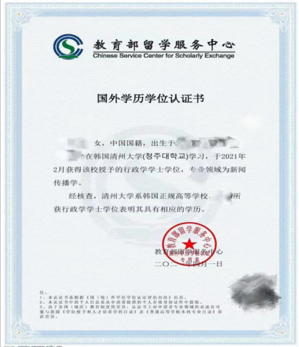 中国教育部留学服务中心不认可成人自考、电大、网络教育、远程教育的本科学历。而韩国清州大学中文3+1专升本项目发放的毕业证书与清州大学4年制全日制的本科毕业证书无任何区别。项目内学生在归国后,可获取教育部留学服务中心的海外学历学位认证。