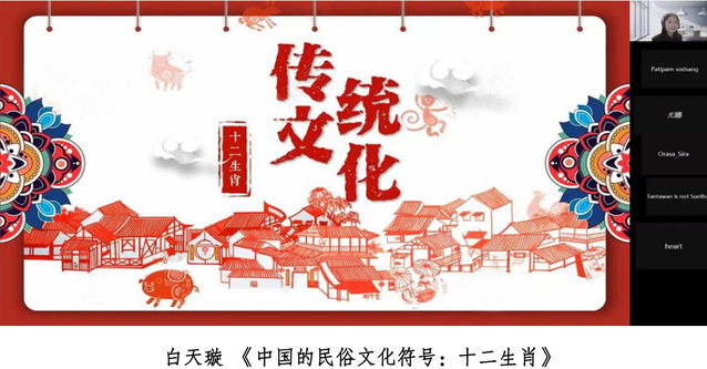 《中国饮茶文化与制茶技术》《中国传统节日的文化内涵》《中国的民俗文化符号:十二生肖》专题分享,使学生在具体的观摩、欣赏、学习中,体会中国文化的魅力,进一步培养学员对中国文化的兴趣。