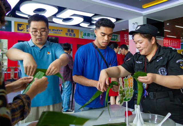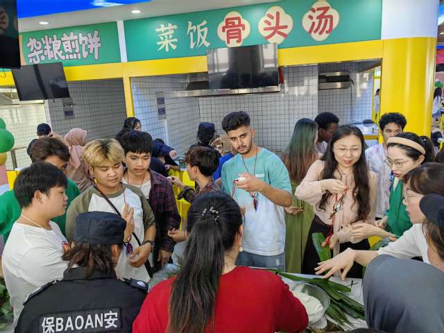 国际合作与交流办公室、后勤管理处(基建办)、基础教学部直属党支部全体支委委员、留学生班主任以及党员教师代表、留学生宿管员、中国学生与在校留学生100余人齐聚第六食堂,共同度过了一个极具中华传统风情的端午节。